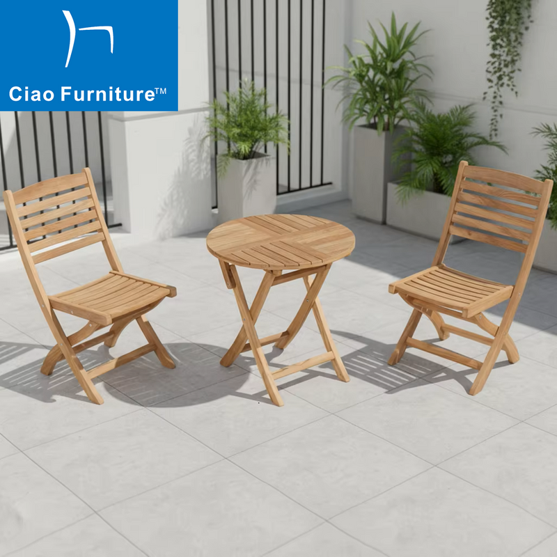 This wooden folding table and chairs are perfect for any outdoor space. Its classical design and durable construction make it a great addition to any bistro set. It includes three foldable pieces crafted from sturdy and durable solid wood. The matching chairs feature a slatted seat and back design. The round table offers just enough space for drinks and food. This bistro set is water and UV-resistant for everyday use on your garden or small balcony area. Its compact foldable design allows easy storage, perfect for any outdoor event or small space.