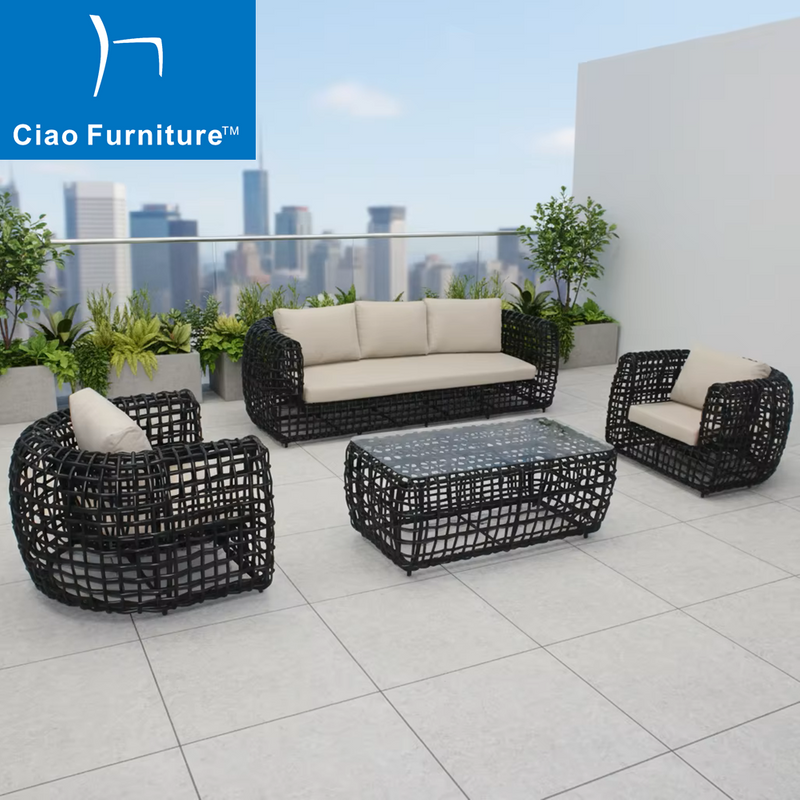 Create a space for family and friends to enjoy the outdoor with this 4 pieces rattan garden sofa set, which fits up to 5 person comfortably and adds the perfect experience to any outdoor space. Outdoor garden furniture set with aluminum frame is durable enough. Handwoven with high quality PE rattan wicker is smooth surface, anti-corrosion, water resistant. Soft seat and back cushions for optimal comfort and relaxation. The coffee table comes with a clear glass top which is more easily to clean. Perfect for the patio, garden, backyard, poolside, and balcony. This rattan sofa set makes you to experience comfort and pleasure.