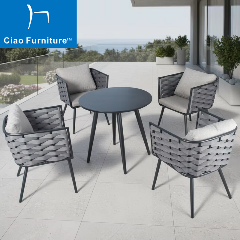 This garden set includes 4 single chairs and coffee table, suitable for indoor, outdoor, balcony, patio, poolside, backyard,etc. The overall frame of chair and table is made of high quality aluminum, which is durable, lightweight, rust proof, weather resistant and will remain beautiful over the time. The chair is designed with armrest and backrest, to upgrade the seating comfort. Experience the ultimate comfort with our soft, handwoven backrest. The chair is handwoven with rope, creating a modern look and providing strength. Weatherproof outdoor fabric is soft to the touch, while wide seat with cushion and pillow provide you a comfortable sitting experience. This garden set is perfect for everyday use in both commercial and residential settings. If you host family and friends at your garden or need extra seating for the cafe shop or restaurant, this round table and 4 chairs set is just what you need.